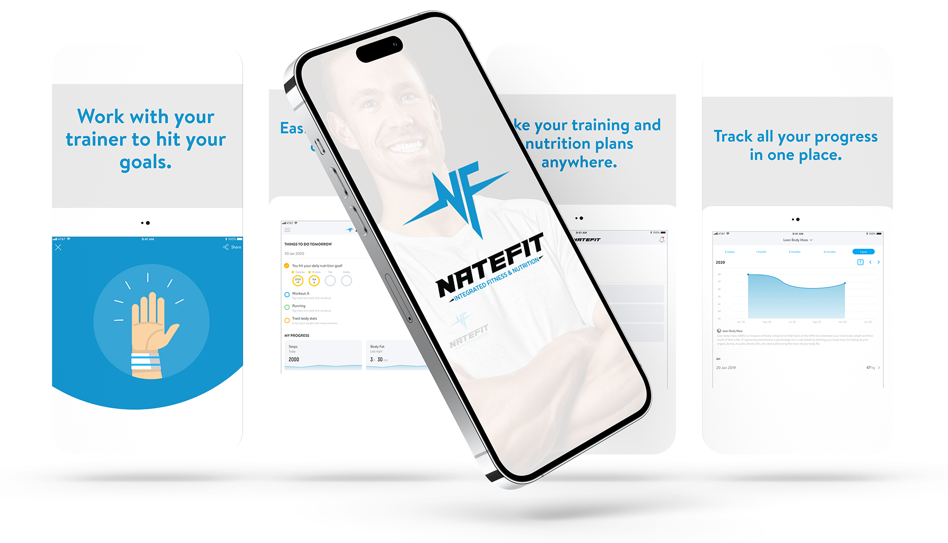 With the NATEFIT App, you can seamlessly track your workouts and meals, measure your results, and reach your fitness aspirations—all with the guidance of your personal trainer.